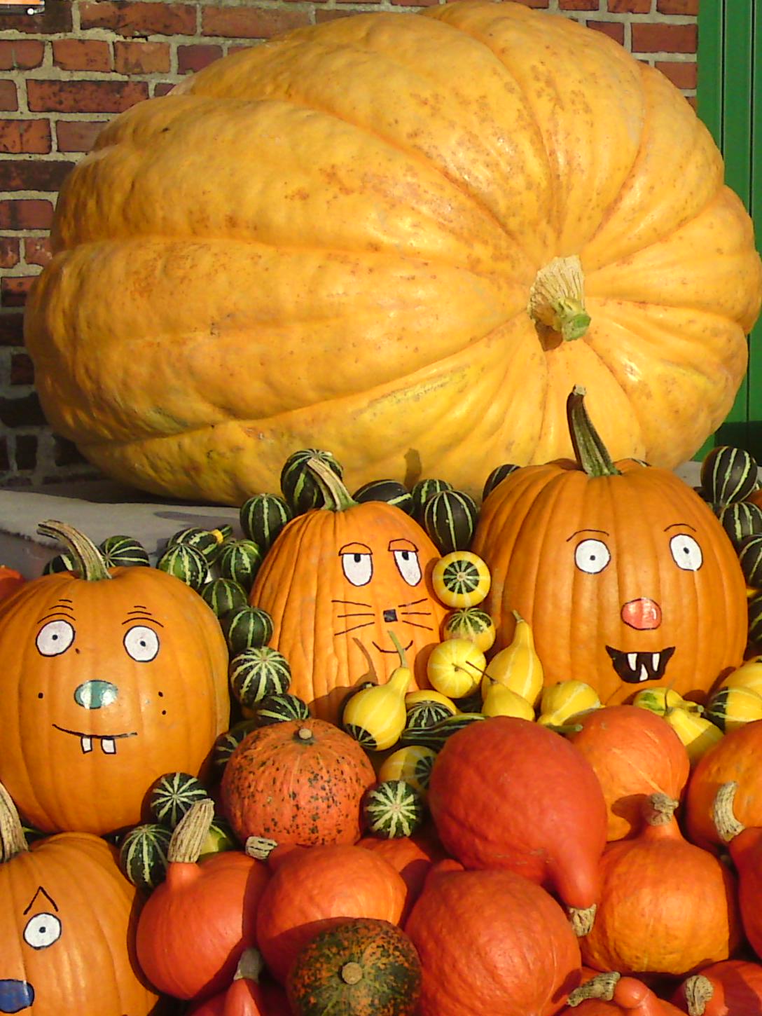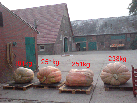 Seit dem Jahr 2003 bauen wir auf unserem Hof auch Riesenkürbisse an. Während wir im ersten Jahr von einem Kürbis mit einem Gewicht von 63,6 kg schon sehr beeindruckt waren, sind unsere Erwartungen mit der Zeit gestiegen. Unser bisher schwerster Kürbis stammt aus dem Jahr 2010 und brachte auf einem Riesenkürbis-Wettbewerb auf der Landesgartenschau in Hemer ein Gewicht von 352 kg auf die Waage.