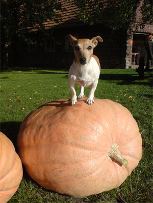 Auch unser Hund ´Jacky` ist schon “auf den Kürbis gekommen” |